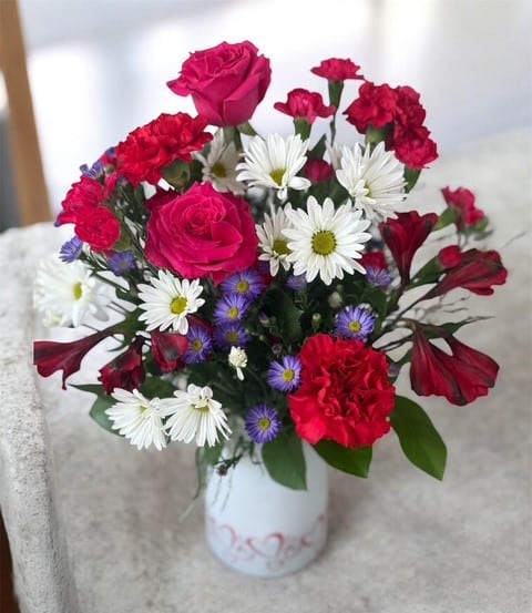 An arrangement of pink, purple, white, and red in a vase adorned with hearts. What better way to say “I Heart You”!